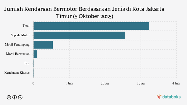Per Okt 2025, Jakarta Timur punya 3,23 juta kendaraan bermotor. Dominan sepeda motor (2,57 juta), disusul mobil penumpang (541,67 ribu), mobil bermuatan (105,05 ribu), bus (12,14 ribu), dan ransus (8.