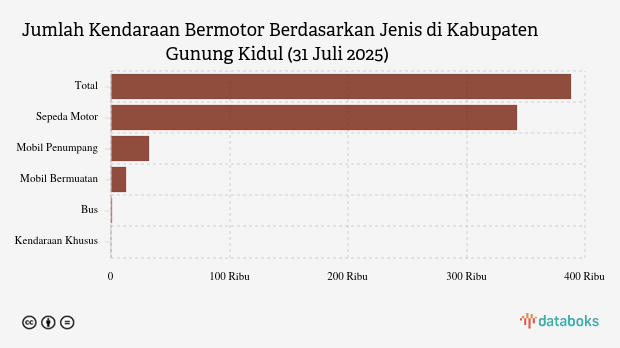 Pada Juli 2025, kendaraan bermotor di Gunung Kidul mencapai 388,2 ribu unit, didominasi sepeda motor (342,49 ribu). Data ini dari ERI Korlantas Polri.